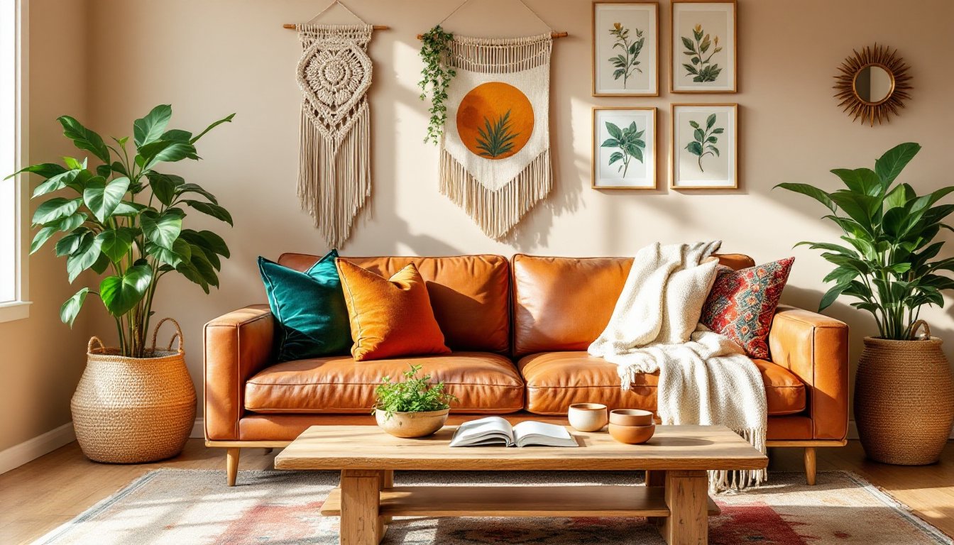 Lighting: Overhead fixtures should make a statement. Rattan pendant lights, Moroccan lanterns, or even a vintage chandelier with Edison bulbs set the tone. Install dimmer switches (single-pole dimmers run $15-25 and take 20 minutes to swap, turn off the breaker first). Layer with floor lamps, table lamps, and string lights. Warm white LEDs (2700K) beat cool daylight bulbs every time. For renters, plug-in pendant kits let you hang statement fixtures without hardwiring.