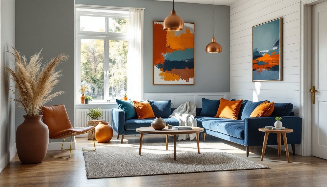 - 10%: Burnt orange throw pillows, copper table lamp, small ceramic vase