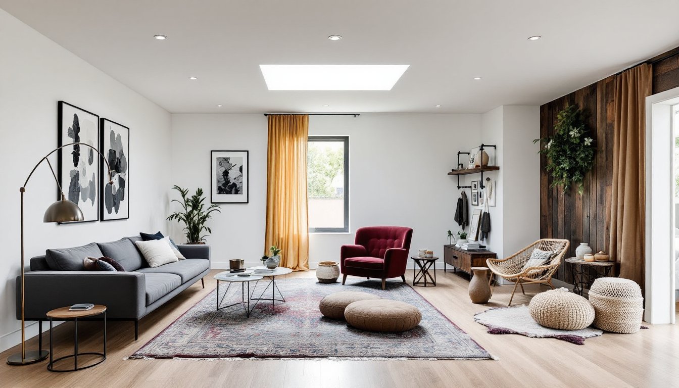 Bohemian (boho) is a popular eclectic subset, characterized by rich colors, global textiles, layered rugs, plants, and a collected-over-time vibe. Materials include rattan, macramé, kilim, and lots of natural fibers.