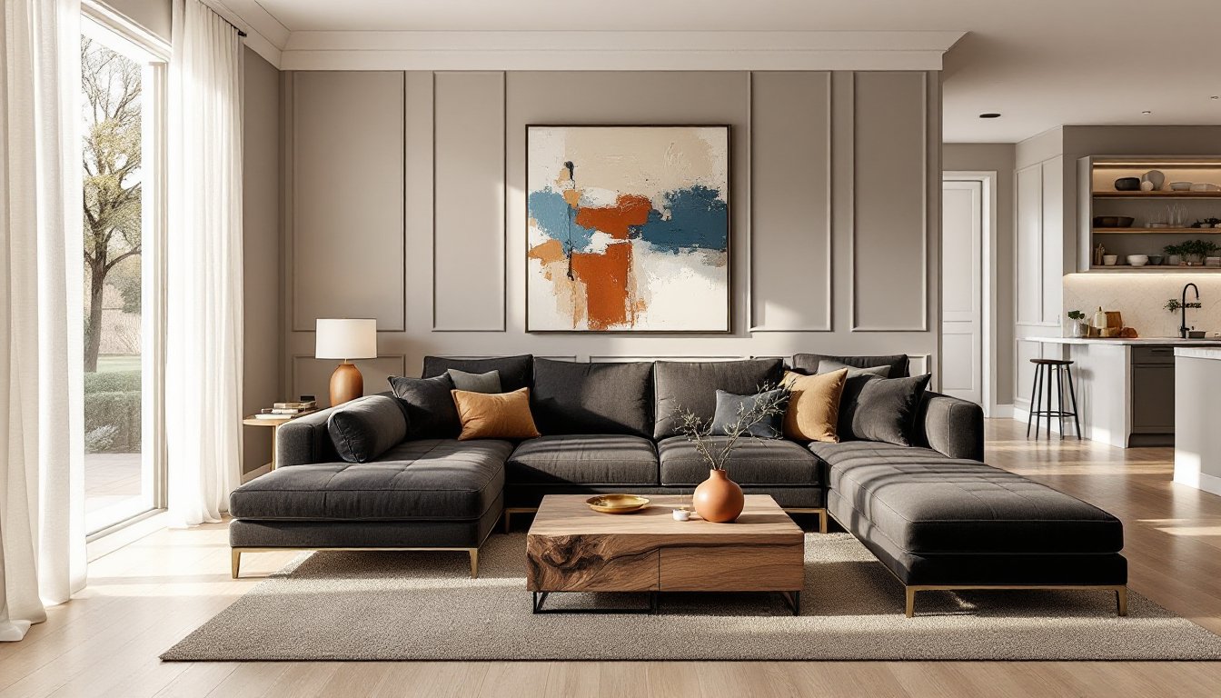 Statement furniture should be sculptural and well-proportioned. A low-profile sectional with clean cushion lines, a cantilevered credenza, or a pedestal dining table with a honed stone top all fit the brief. Avoid overstuffed pieces or anything with visible nailhead trim, those read traditional, not modern.